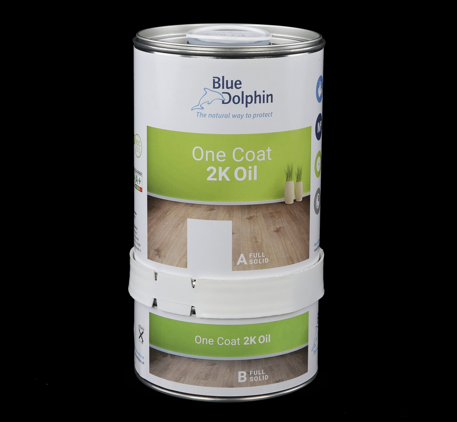 Blue Dolphin 2K Oil is een oplosmiddelvrije, impregnerende 2 compontenten 'full solid' olie voor het beschermen en kleuren van houten oppervlakken in één laag. Naast 16 verschillende kleuren van deze 2K olie zijn wij uniek met onze 2K Oil Bianco (onbehandelde look olie). Hiermee behoudt u de natuurlijke uitstraling van de vloer en blijft deze heel mooi licht van kleur. Zeer geschikt voor parket, houten vloeren, houten meubelen en andere houten oppervlakken. Met 1 liter 2K Olie (800ml comp. A + 200ml comp. B) kunt u circa 40 - 45 m² houten oppervlak behandelen. Voor het maken van een kleurensample zijn alle 17 kleuren ook verkrijgbaar in demopotjes. Ook kunt u er voor kiezen om de 2K Olie met een extra laag Hardwax-olie, Eco Super Seal 2K of Eco Wood 2K af te werken.