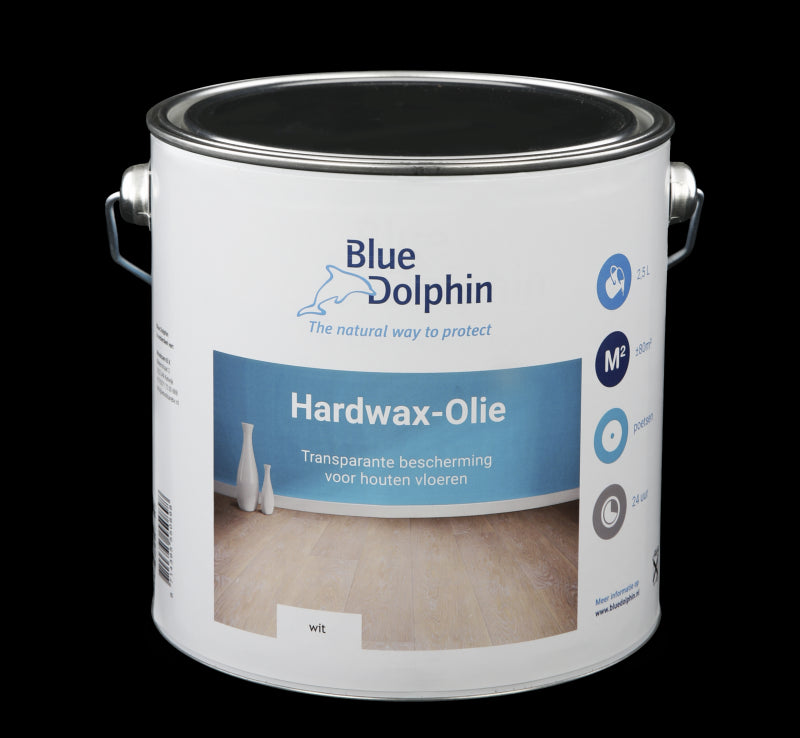 Blue Dolphin Hardwax-olie Wit dient als grondlaag op eiken en andere kleurbare houtsoorten. Dus moet u na behandeling de Hardwax Olie Wit altijd afwerken met BD Hardwax Zijdeglans of Mat. Daarmee zorgt u voor een belastbaar, vuil-en waterafstotend oppervlak die zeer krasbestendig is. Een groot voordeel van Hardwax-Olie is dat het plaatselijk bij te werken is, dit maakt het zeer gebruiksvriendelijk. Hardwax-olie is geschikt voor de meest gangbare houtsoorten, kurk, natuursteen en platen op houtbasis. Daarentegen raden wij voor tropische houtsoorten aan de BD One Coat 2K Transparant te gebruiken als eerste laag.